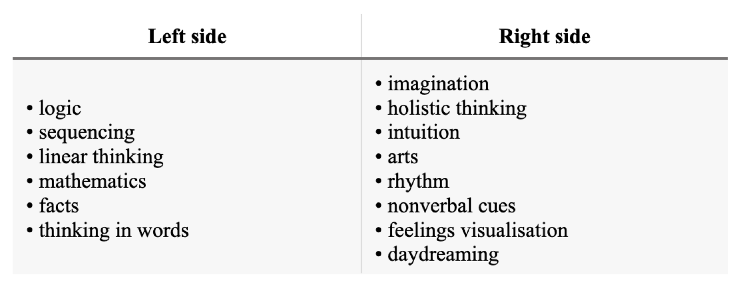 With its roughly 171 billion cells - including about 86 billion neurons and 85 billion other cells called glial cells, supporting the neurons – our brain enables us to be human. It seems that the left brain and right sides of your brain help us with the following: